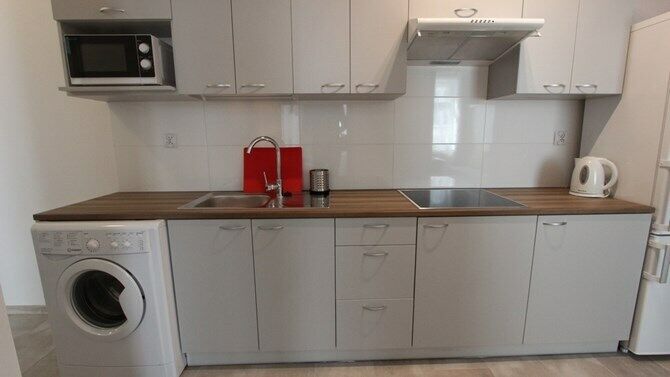 mikrofalówka, lodówka z zamrażalnikiem, zlew, pralka.