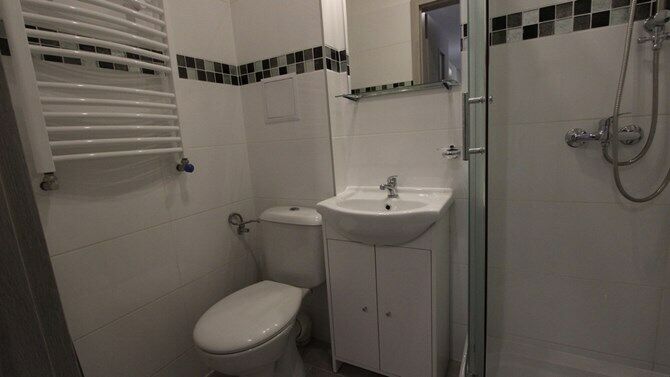 Łazienki: szafki na kosmetyki, kabina prysznicowa, WC, umywalka,