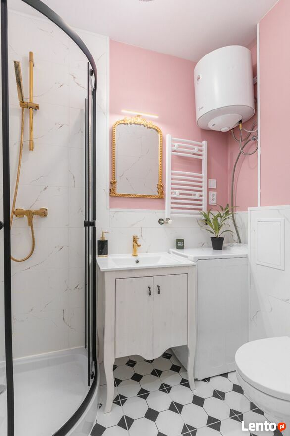 Kompleksowo urządzoną łazienkę i aneks kuchenny.