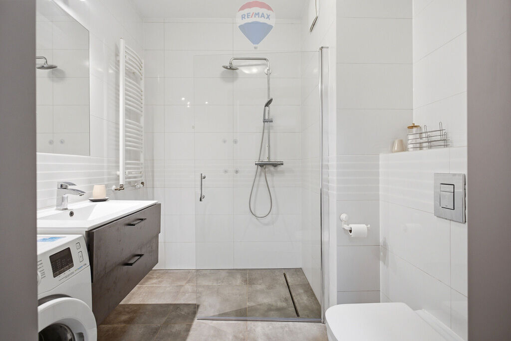 przeszklony prysznic, pralkę, umywalkę oraz grzejnik drabinkowy.