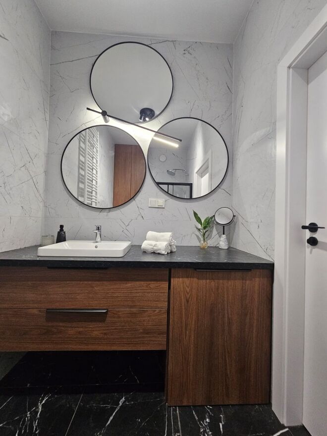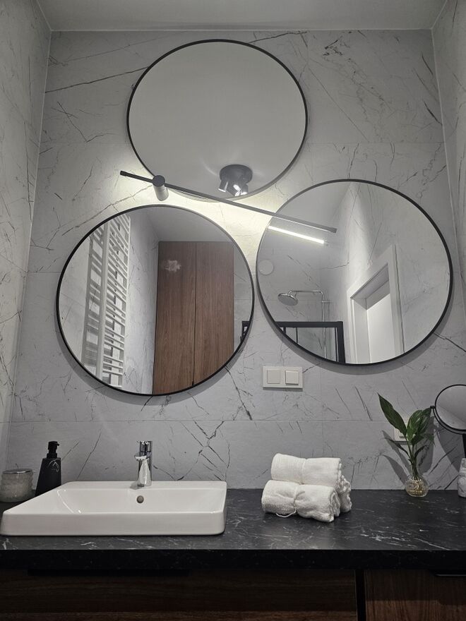 W łazience zabudowy na wymiar - geberitu oraz umywalki z pralką Whirpool - dają dużo miejsca do przechowywania, a trzy duże lustra o średnicy 80 cm każde potęgują wrażenie przestrzeni.