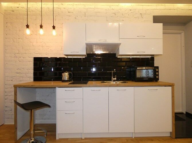 opiekacz, lodówka, czajnik elektryczny, okap, zlewozmywak.