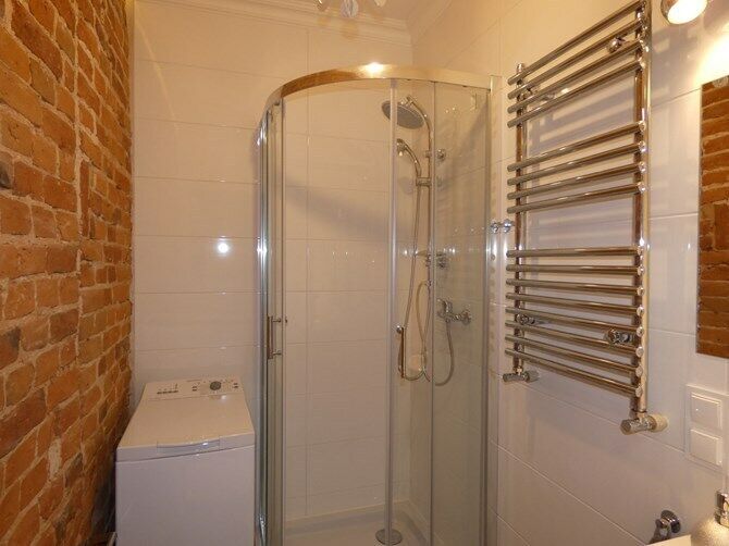 Łazienka: kabina prysznicowa, WC, szafka z umywalką, lustro, pralka.