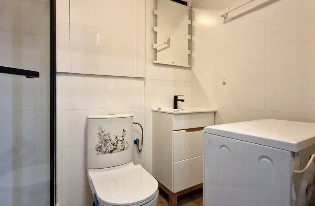 Łazienka (razem z WC): pralka, kabina prysznicowa, umywalka, lustro,