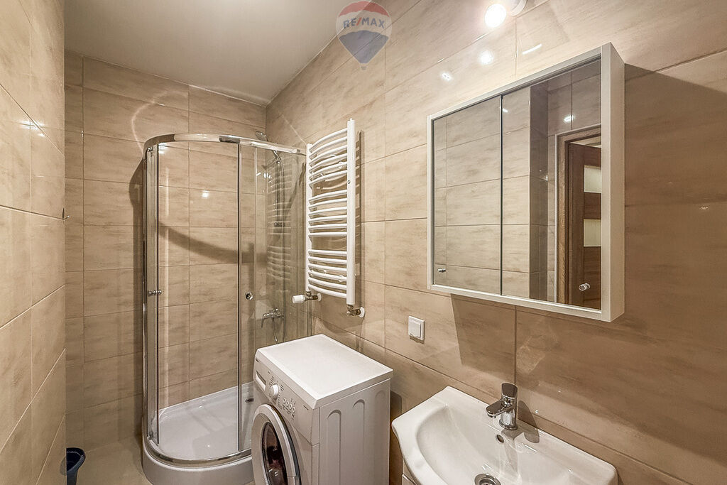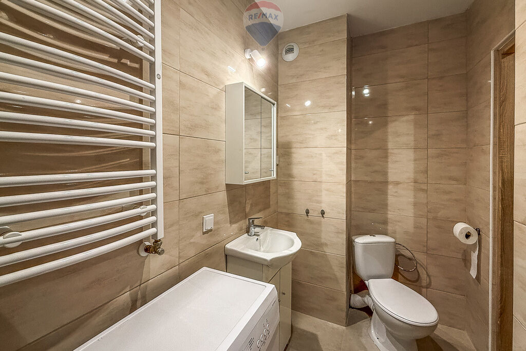 wyposażona w pralkę, prysznic, umywalkę oraz grzejnik drabinkowy.