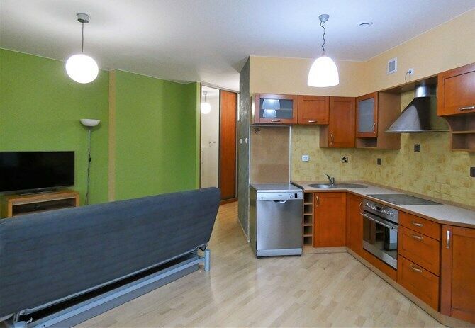 Pokój z aneksem: szafki, lodówka, zmywarka, piekarnik,