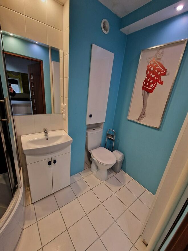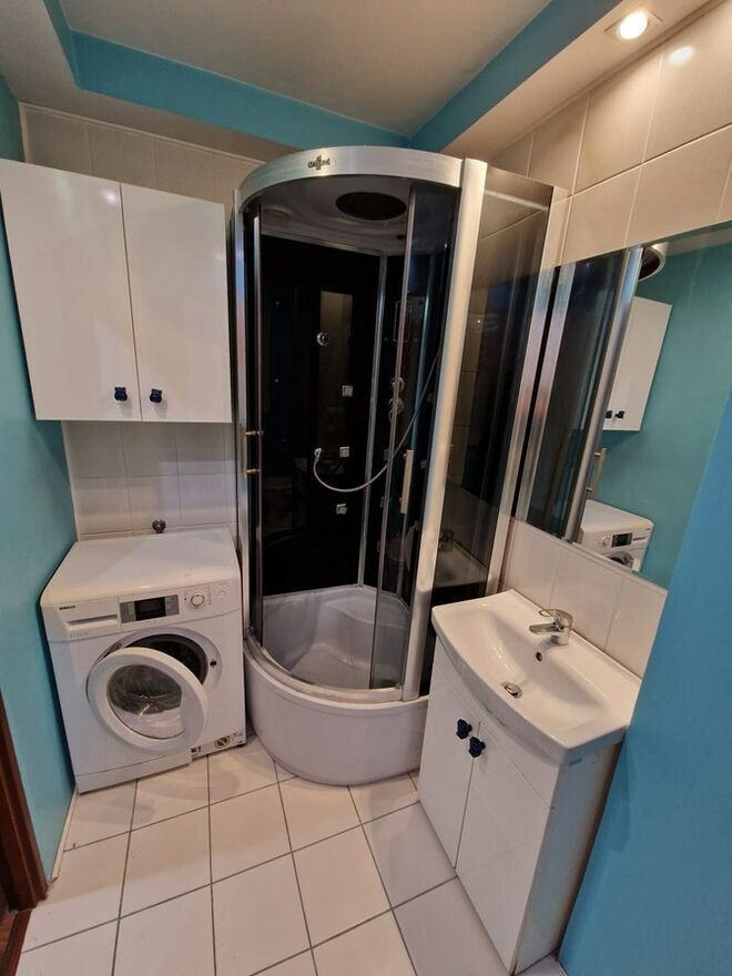 Łazienka razem z WC: kabina prysznicowa, pralka, wisząca szafka,