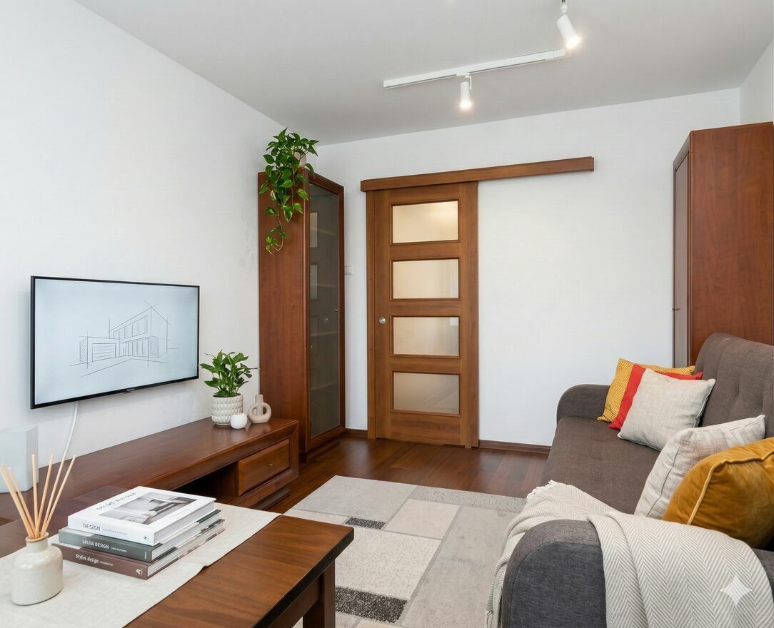 Salon: rozkładana sofa, telewizor, szafy, komody.
