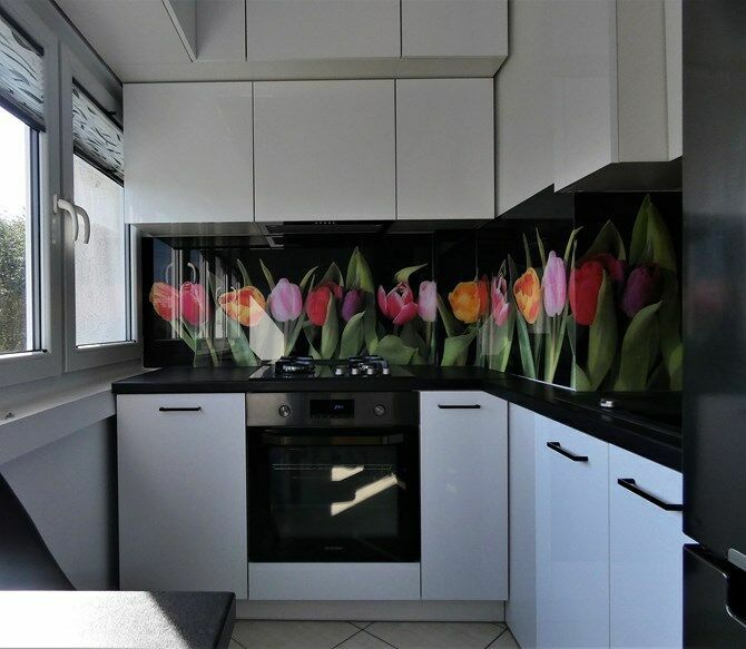 Kuchnia: lodówka, zmywarka, piekarnik, kuchenka, stół z krzesłami.
