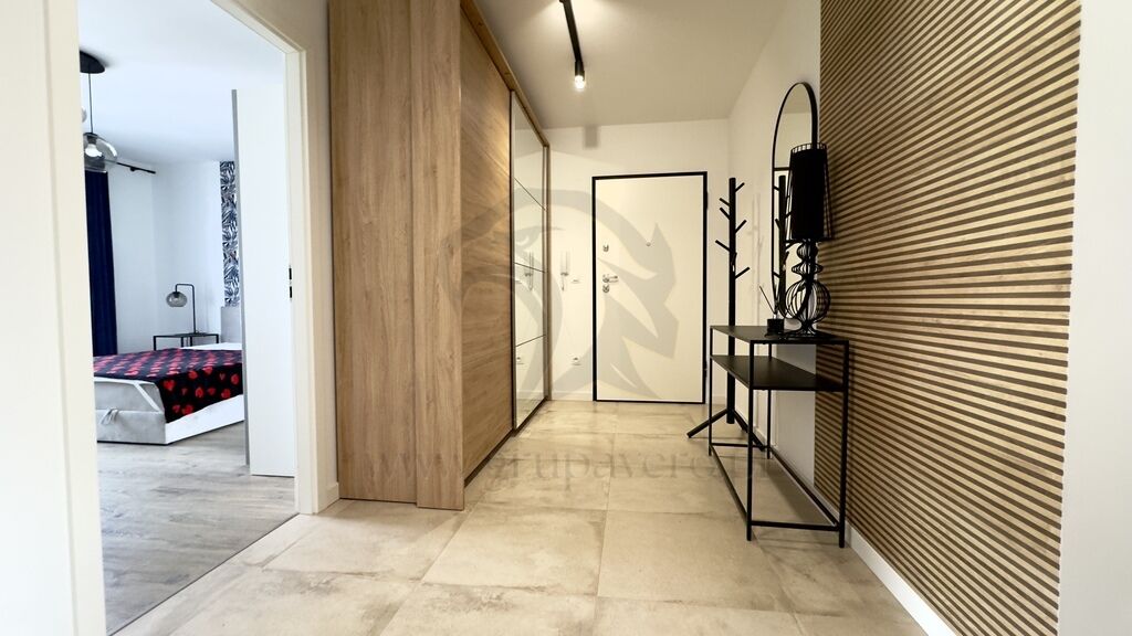 •Duży przedpokój z szafą w zabudowie i lustrem,