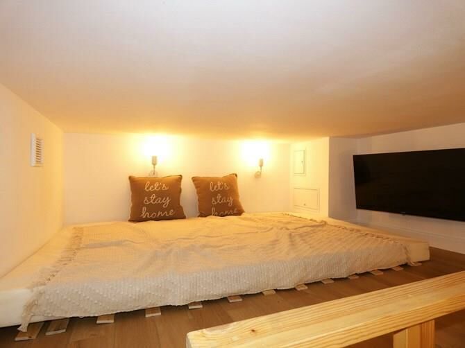 Antresola: materac, stoliczek, telewizor.