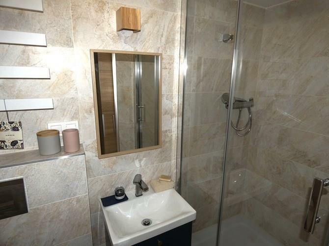 Łazienka: kabina prysznicowa, umywalka.