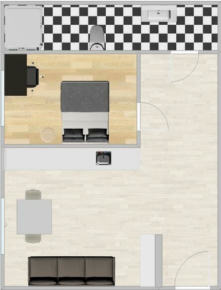 Mieszkanie składa się z dwóch pokoi – salonu z aneksem kuchennym