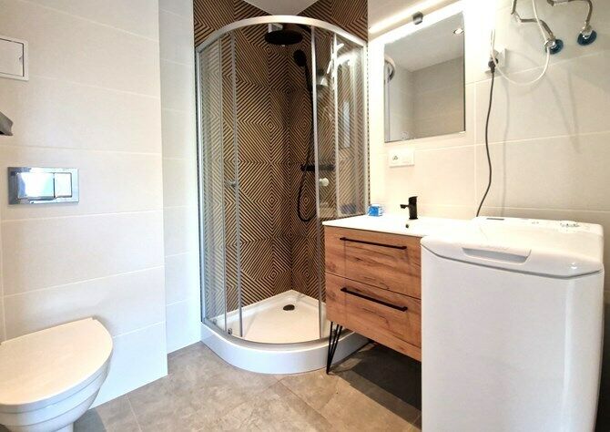 Łazienka razem z WC: lustro z półką, kabina prysznicowa, pralka.