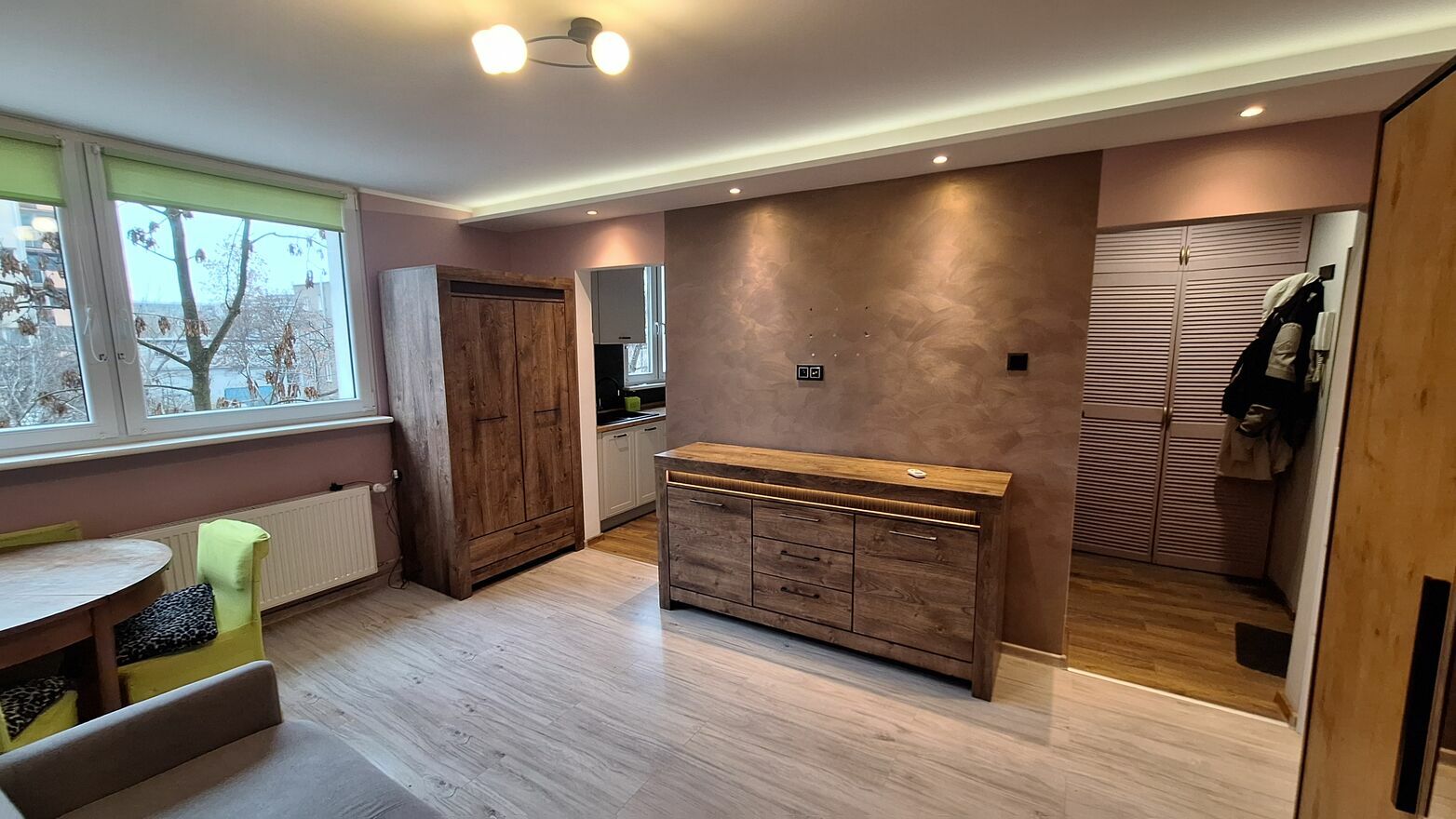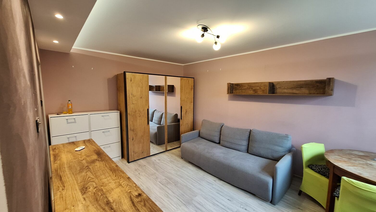 - I POKÓJ: ściany: gładzie gipsowe, malowane; podłoga panele, okna PCV, rolety okienne, kanapa rozkładana, duża szafa garderoba, zestaw komoda + szafa, stół, krzesła, dodatkowa komoda