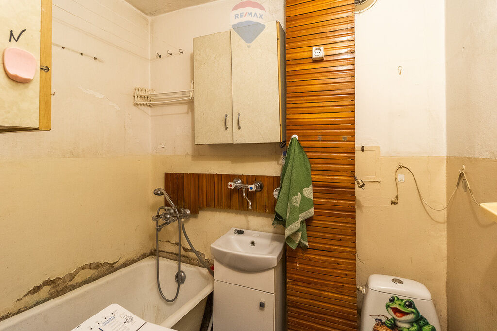 utylizacji. Łazienka z wanną, umywalką, WC oraz pralką. W