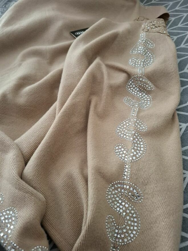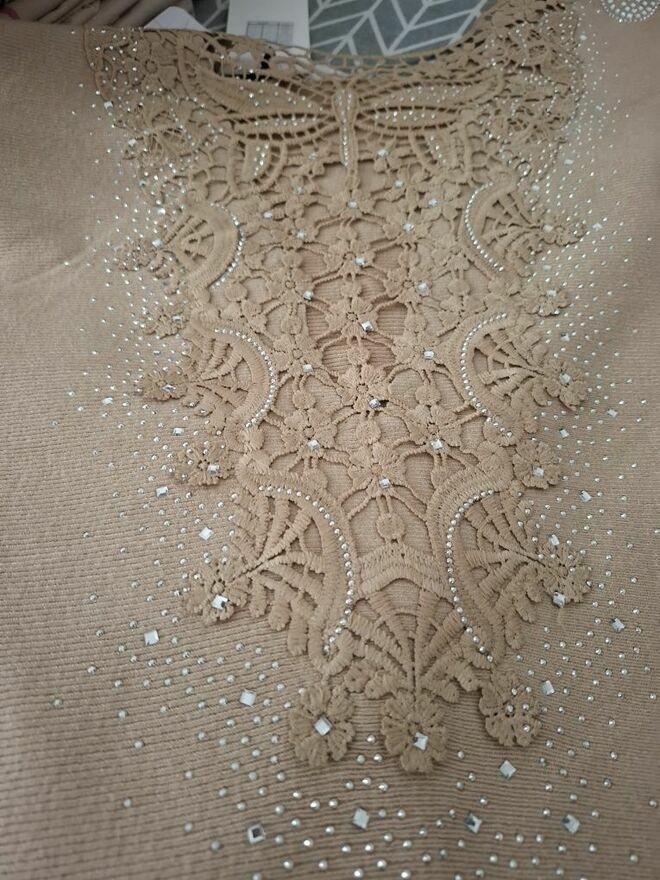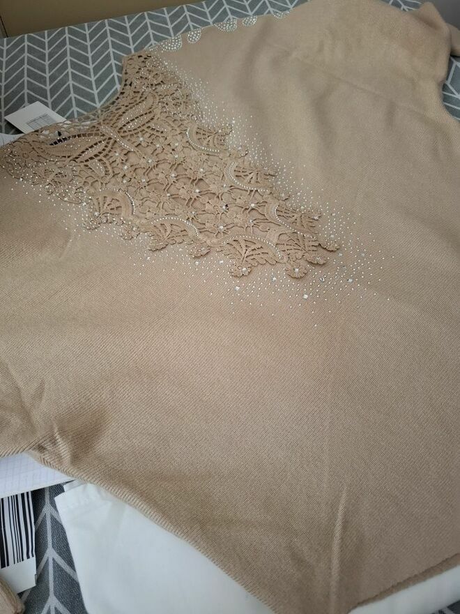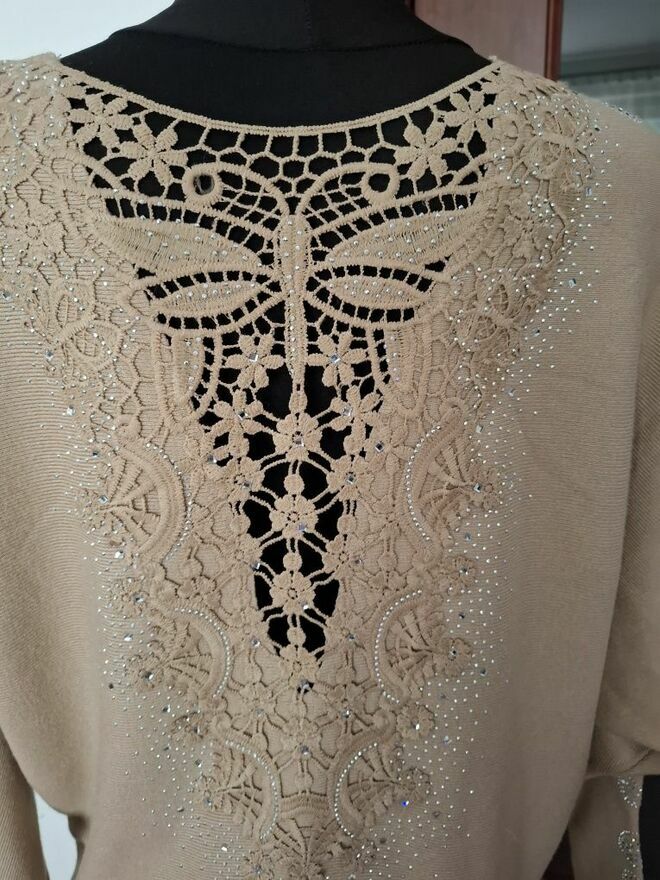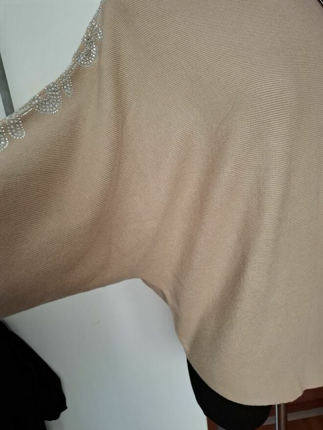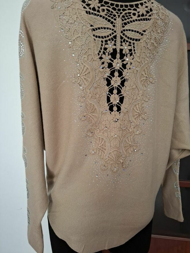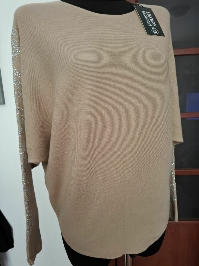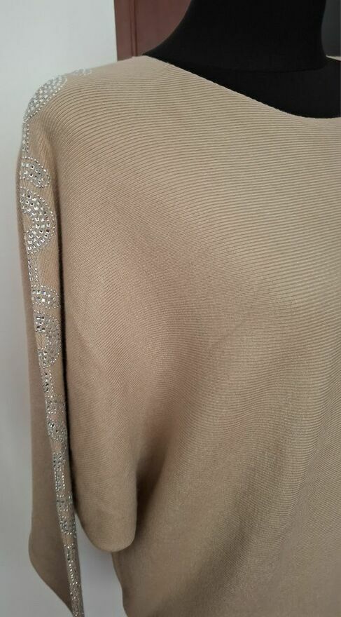 Bluzka sweterkowa w kolorze beżowym. Wygodna i modna, idealna na chłodniejsze dni. Dodatkowy urok nadaje jej nietoperzowy krój. Doskonała propozycja dla osób lubiących oryginalne stylizacje. Z tyłu piękny ażur. Nowa z metką, firmy Luxury Fashion. Skład tkaniny: 50% wiskoza, 28% poliester, 22% nylon. Wymiary: biust w najszerszym miejscu 59- 65cmx2, rękaw od dekoltu 71cm, biodra 46- 54cm x2, długość 63cm (dół półokrągły boki krótsze). ZapraszamBarbara