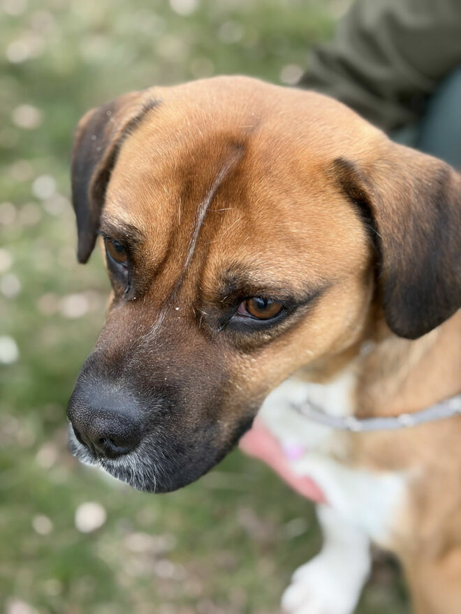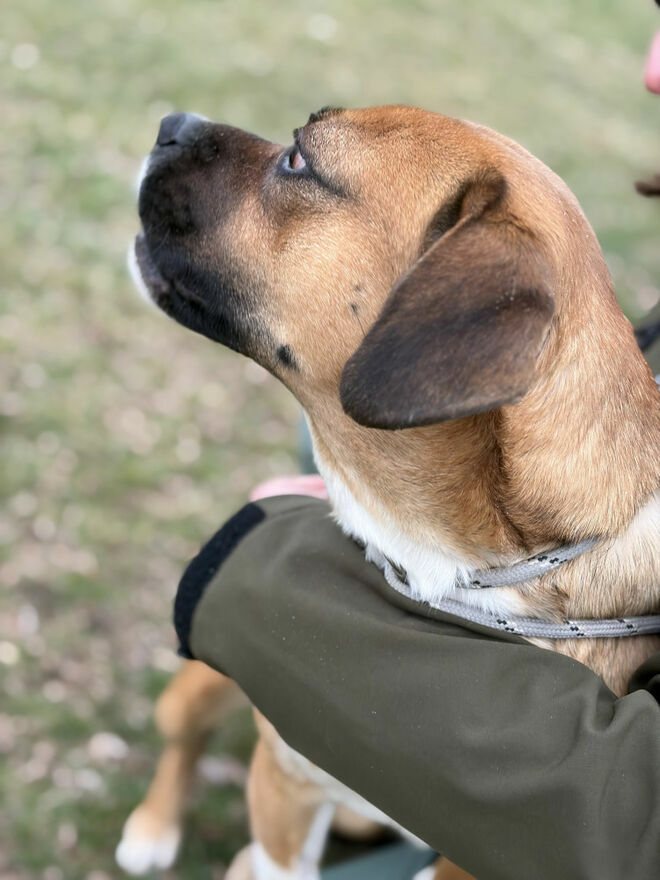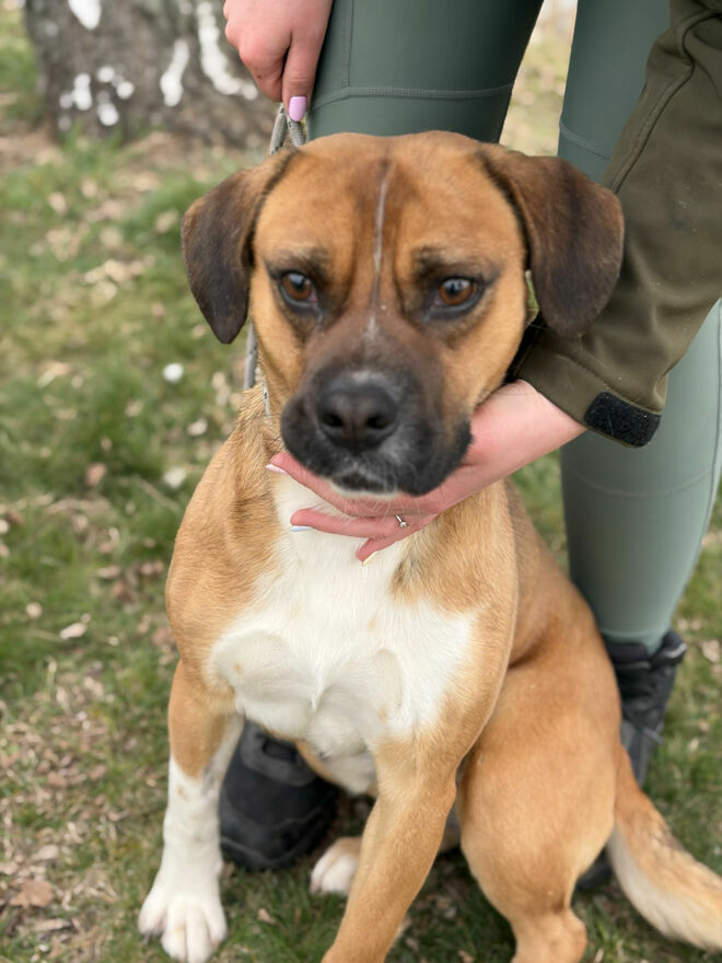 Box to około roczny psiak, któremu gdzieś w genach zaplątał się bokser. Energiczny młody proludzki . Na smyczy ciągnie bo kto młodemu zabroni jak świat przed nim stoi otworem. Box szuka domu z ludźmi energicznymi takimi , którzy pozwolą mu się wybiegać, którzy tak jak on lubią gnać przez życie. Chłopak nie ma problemu z innymi psami. Nawiązuje dość szybko z innymi psiakami kontakt.