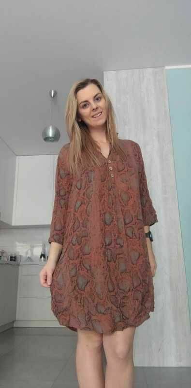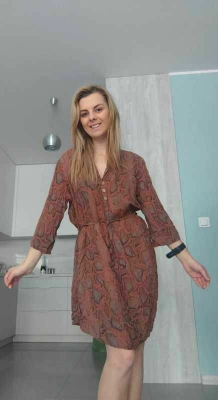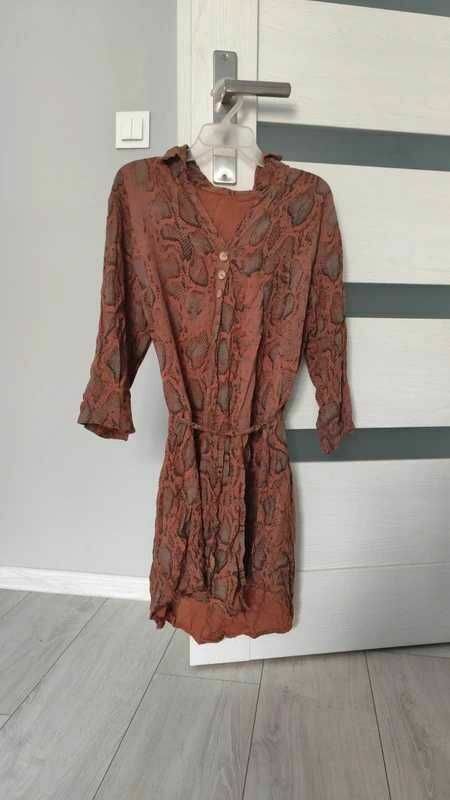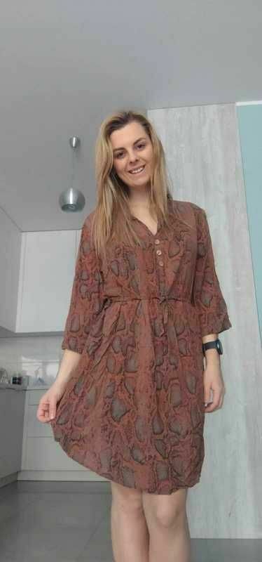 Mam na sprzedaż brązową sukienkę we wzory z guzikami i wiązaniem w pasie. Rękaw 3/4.Bardzo przewiewna i lekka, wykonana z 100% wiskozy.