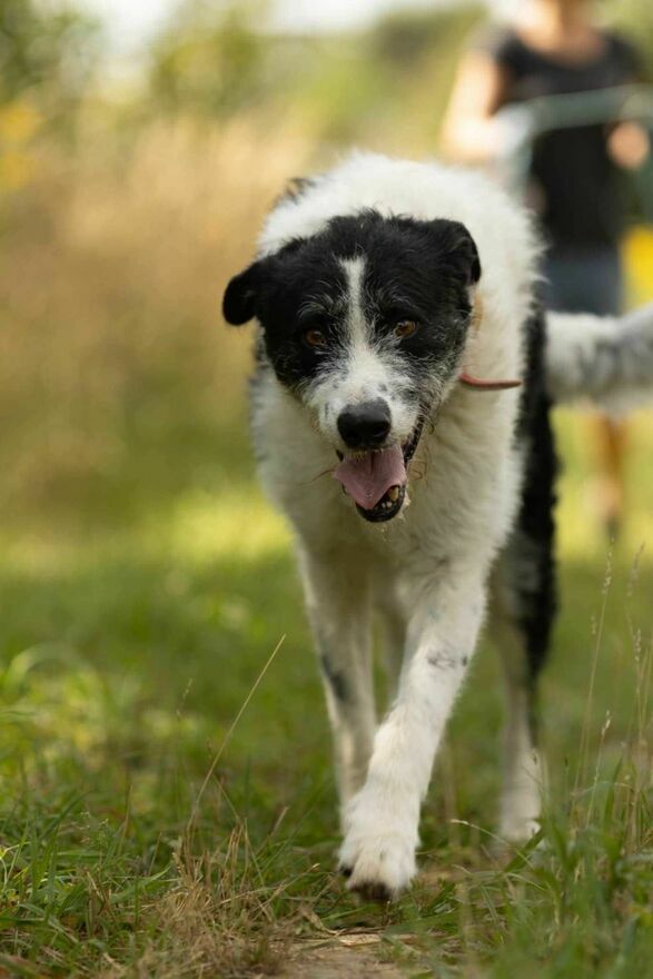 Pięknie spaceruje na smyczy, nie ciągnie, uwagę skierowaną ma na człowieka i za chwilę wolności odwdzięcza się " buziakami ".