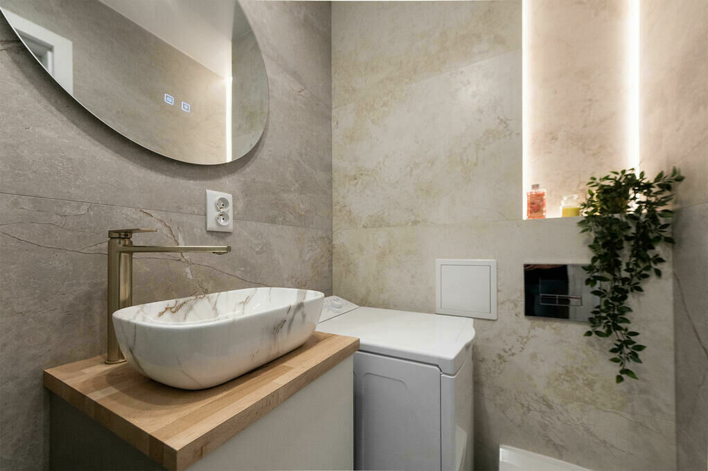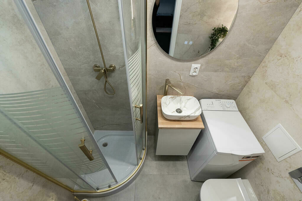 - Łazienka wyposażona w pralkę, prysznic, umywalkę i WC.