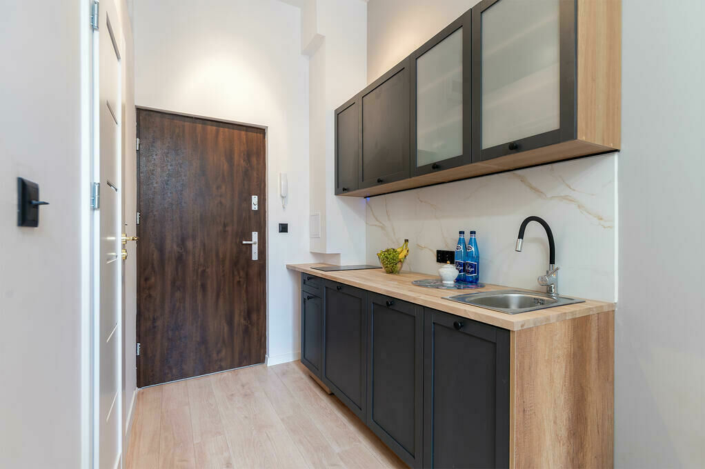- Kuchnia z nowoczesną kuchenką indukcyjną oraz zmywarką, co ułatwia codzienne gotowanie i sprzątanie.