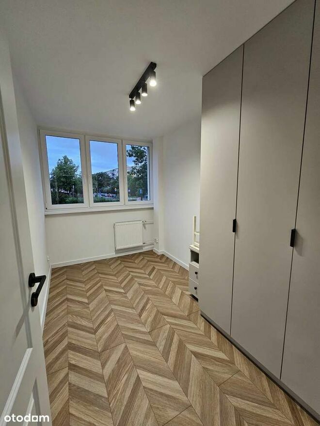 Przystosowana ściana pod tv (system podtynkowy pod kable oraz umocowanie tv na ścianie). Szafa na całą szerokość pokoju pod sufit. Panele na podłodze w nowoczesnym stylu "jodełka" AC6.