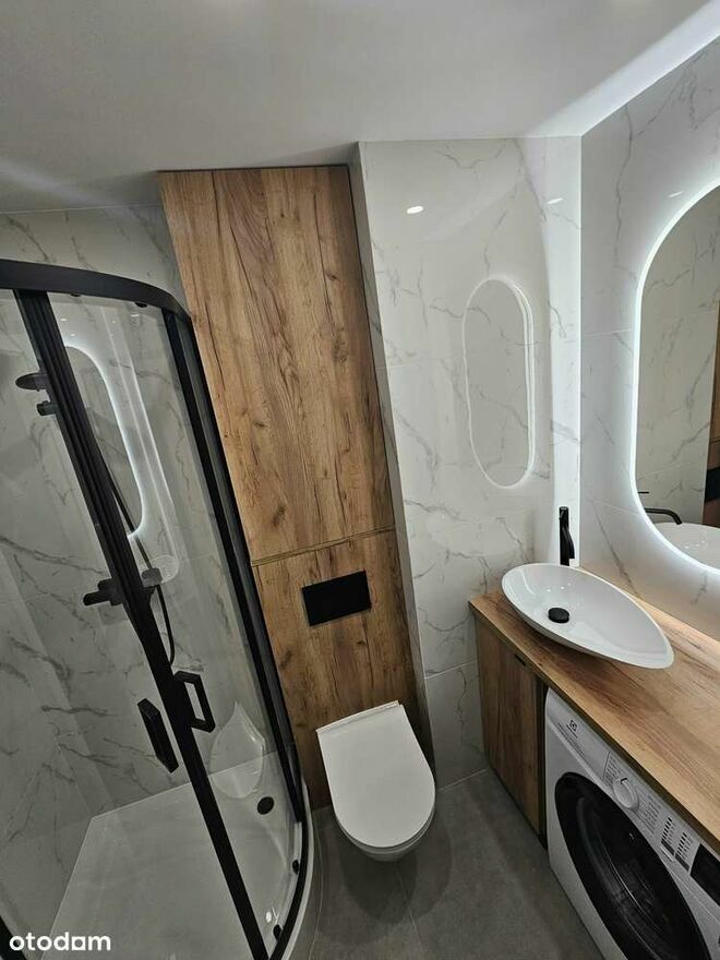 Pralka z nowoczesnym silnikiem interwałowym Elektrolux, szafka pod umywalke oraz nad geberitem wykonana przez stolarza. Brodzik - Deszczownica w zestawie ze słuchawka oraz bateria z wylewką (kran). Nad umywalką lustro zapalane led.