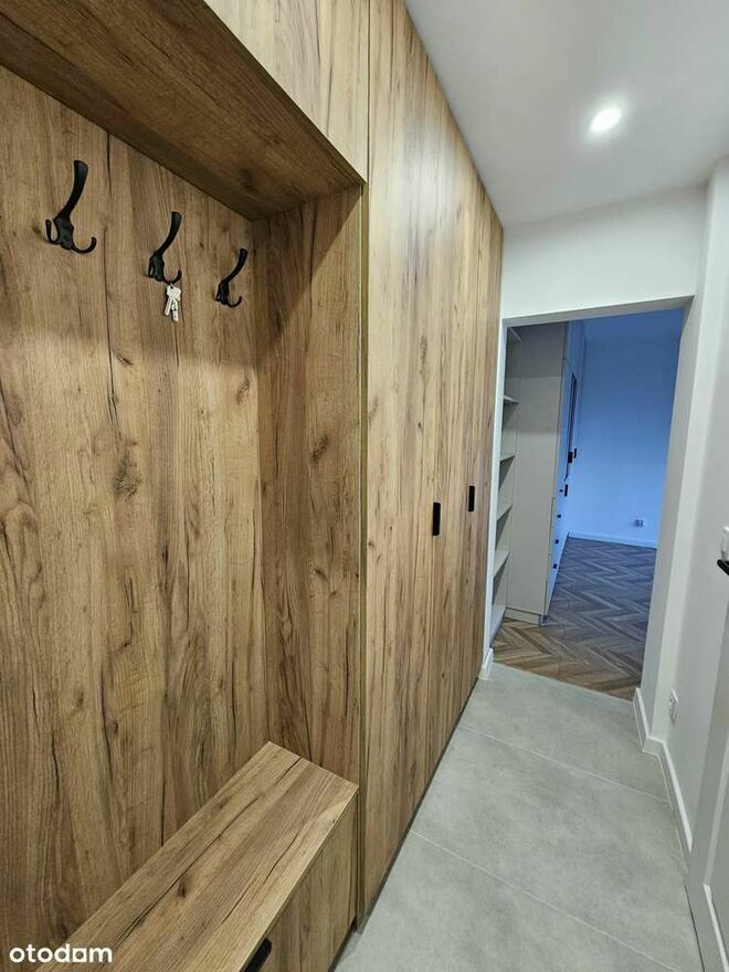 Szafa z siedziskiem na wymiar pod sufit wykonana przez stolarza. Nowe drzwi wejściowe, nowoczesne drzwi do łazienki oraz sypialni. Na podłodze gres.