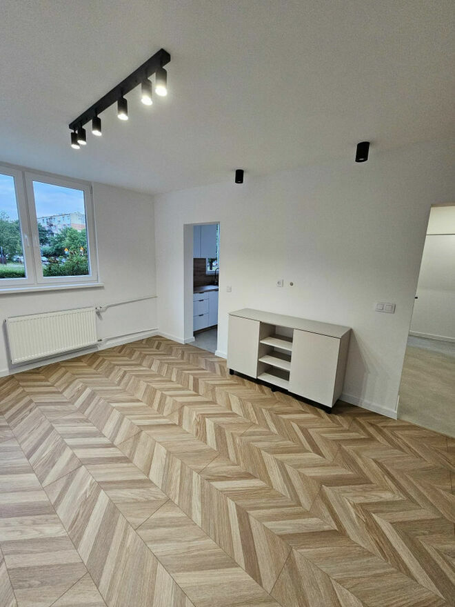 Przystosowana ściana pod tv (system podtynkowy pod kable oraz umocowanie tv na ścianie), naprzeciwko okien zwis pod stół. Kilka punktów świetlnych (osobne zapalnie nad tv, nad rogówką). Panele na podłodze w nowoczesnym stylu "jodełka" AC6. Nowoczesne drzwi do sypialni.