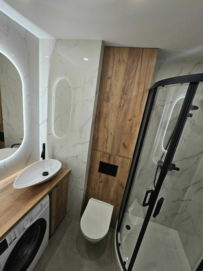 Pralka z nowoczesnym silnikiem interwałowym Elektrolux, szafka pod umywalke oraz nad geberitem wykonana przez stolarza. Brodzik 90 - deszczownica w zestawie ze słuchawka oraz bateria z wylewką. Nad umywalką lustro zapalane led.
