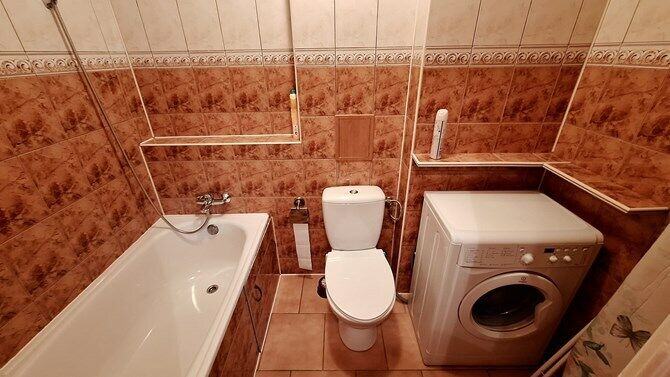 Łazienka: wanna, kompakt WC oraz pralka.
