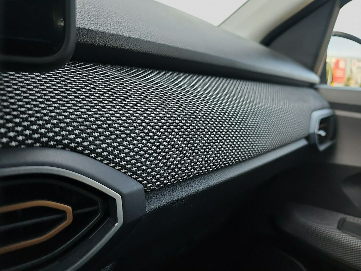 - tapicerka materiałowa czarno-szara z jasnymi przeszyciami i wstawkami na desce
