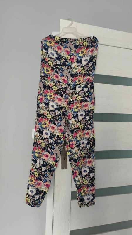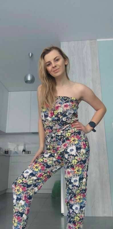 Sprzedam piękny długi kombinezon w kwiaty, bez ramiączek. Na dekolcie gumka. Super wygodny i dopasowujący się do ciała. :)100% wiskoza