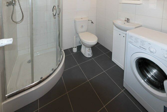 Łazienka razem z WC: lustro z półką, kabina prysznicowa, pralka.