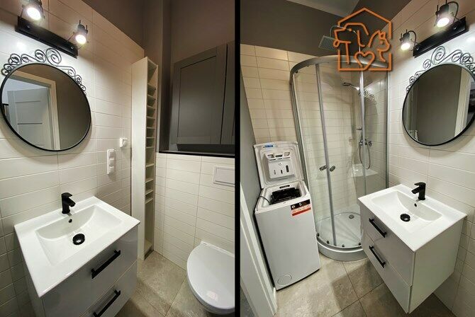 Łazienka z WC: kabina prysznicowa, umywalka z lustrem, pralka,