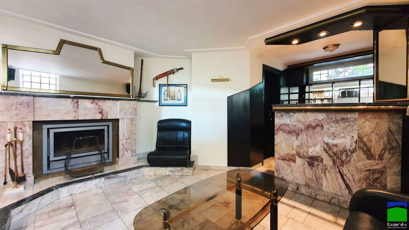 pokój wypoczynkowy z kominkiem i barkiem, wc.