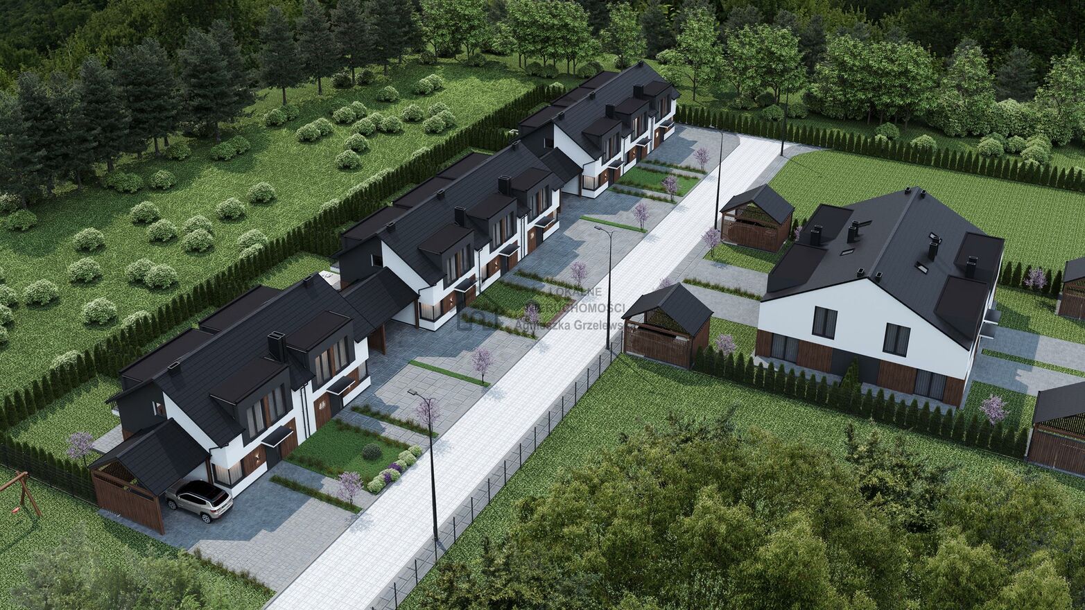 Zabudowania w inwestycji Złotno Widoki tworzą jednolitą i spójną stylistycznie przestrzeń. Zostały połączone szczegółowo zaprojektowaną drogą z wygodnymi podjazdami i miejscami parkingowymi przy budynkach. Jakość, którą prezentują to wygodna, zielona, otwarta przestrzeń sąsiedzka od frontu domów i prywatne, ogrodzone ogródki współgrające z naturą i otoczeniem z tyłu budynków.