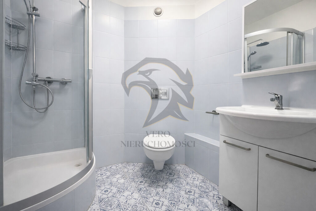 mniejsza łazienka z kabiną prysznicową, natomiast w głębi czeka