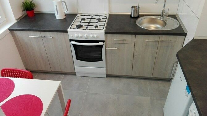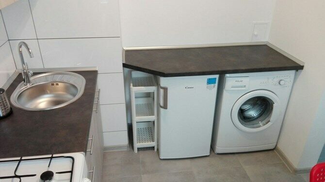 Kuchnia: szafki, lodówka, pralka, kuchnia, stół z krzesłami,