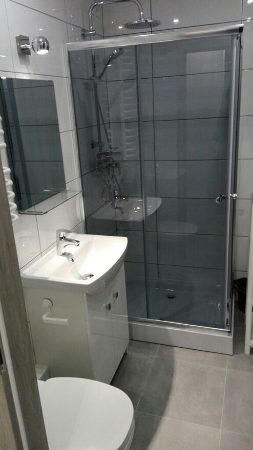 Łazienka: kabina prysznicowa, umywalka, WC.