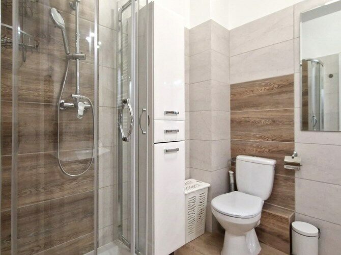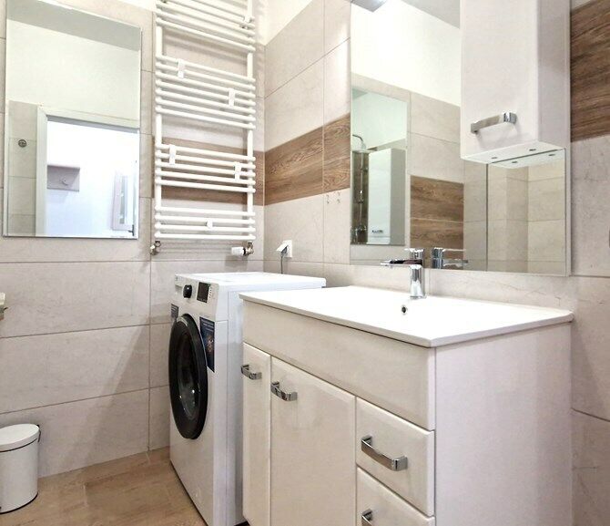 Łazienka razem z WC: kabina prysznicowa, umywalka, szafki, pralka,