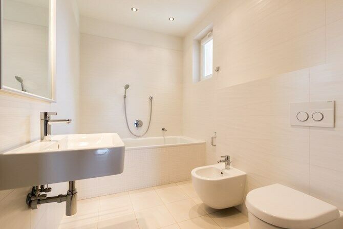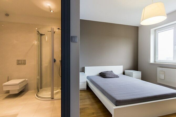 brodzik, bidet, umywalkę, WC, duże oświetlone lustro.