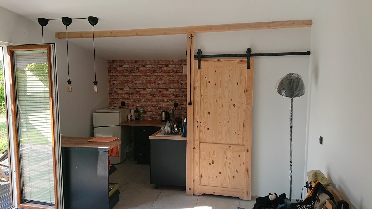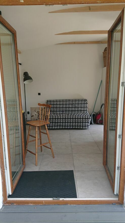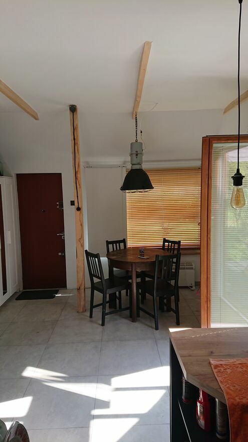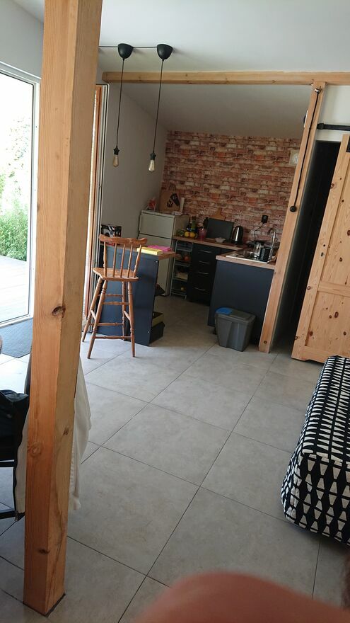 Na podłodze położone są płytki ceramiczne, kuchnia wyposażona jest w meble oraz sprzęt AGD (lodówka, kuchenka indukcyjna).