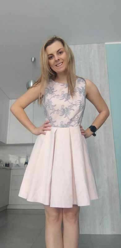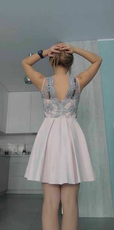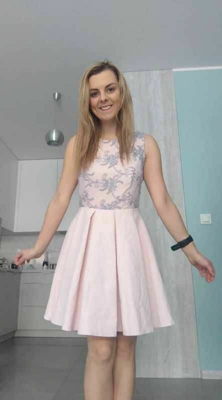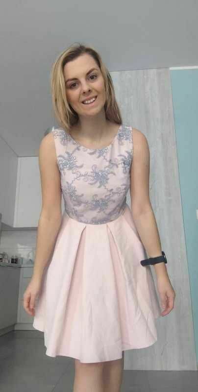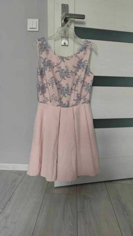 Sprzedam różową sukienkę z pięknym srebrnym wzorem róż na górnej części. :) Sukienka jest rozszerzana od pasa w dół. Zapinana na zamek.Idealna na różne okazje, przyjęcia, wesela, komunie.