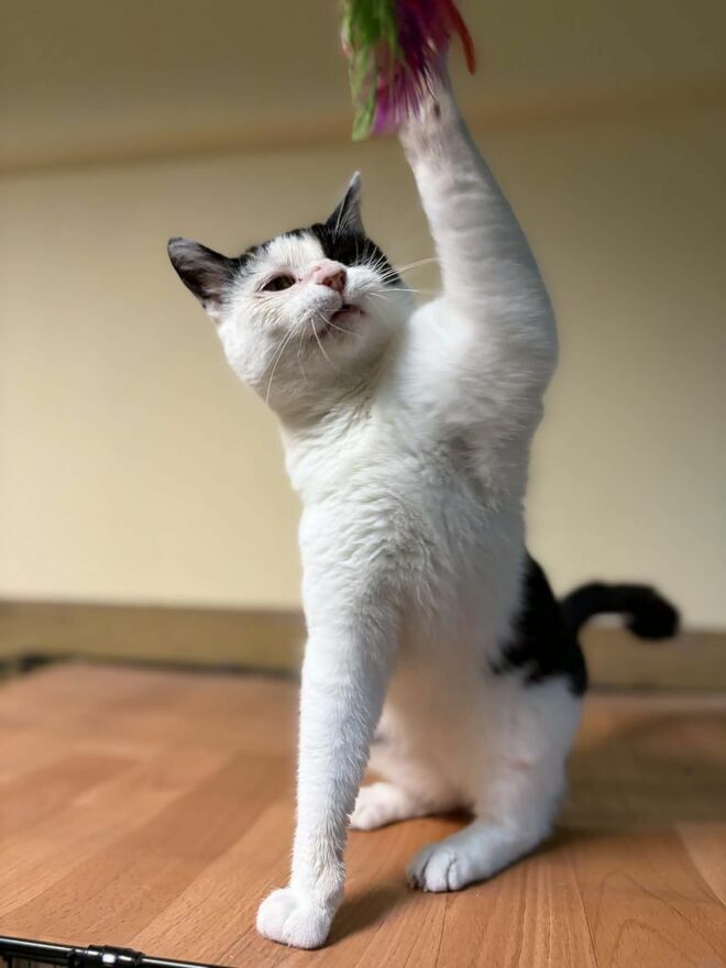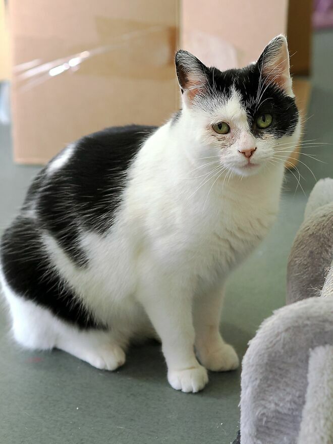 Finki nikt nigdy nie kochał… Dziś potrzebuje człowieka o wielkim sercu, który pokaże, że można kochać filigranową kotke po przejściach z wiecznie załzawionymi oczami, kotkę radosną lecz stawiającą granice, kotkę, która boi się dotyku, a jednocześnie szuka kontaktu z człowiekiem. Kotke, która wzięta na ręce niemal walczy o przetrwanie, jakby dotyk kojarzył jej się z czymś złym, z czymś rodzącym cierpienie… Kotkę, która chce zaufać i pokochać – a jednak doświadczenia z przeszłości ją blokują… Nie wiemy co Finka przeszła, że jest właśnie taka. Pełna sprzeczności. Ma 3 lata i całe dotychczasowe życie spędziła na wsi – rodząc niechciane kocięta i próbując przetrwać w trudnym środowisku. Uwielbia się bawić – więc ktoś ją tego nauczył. Niestety – stroni od dotyku, a więc od ludzi, poza okazjonalną zabawą, nie dostała nic więcej, chyba, że założymy, że człowiek nie traktował jej dobrze. Finka ma złamany ogon, trzyma go zwinięty w „precelek” który nigdy się nie prostuje. Na szczęście nie przeszkadza jej to w normalnym funkcjonowaniu. Nie przyjdzie na kolana czy po porcję głasków – na to jeszcze za wcześnie – za to będzie codziennie witać w drzwiach, codziennie zachęcać do zabawy, będzie zaglądać co tez przyniosłeś w torbie, doskonale też dogada się z kocim rezydentem. To idealna kotka na dokocenie, z ogromnym potencjałem na pokochanie odpowiedniego człowieka. Człowieka, który nauczy ja miłości i sprawi, że Finka zapomni o złej przeszłości, która tak bardzo odbiła się na jej psychice.