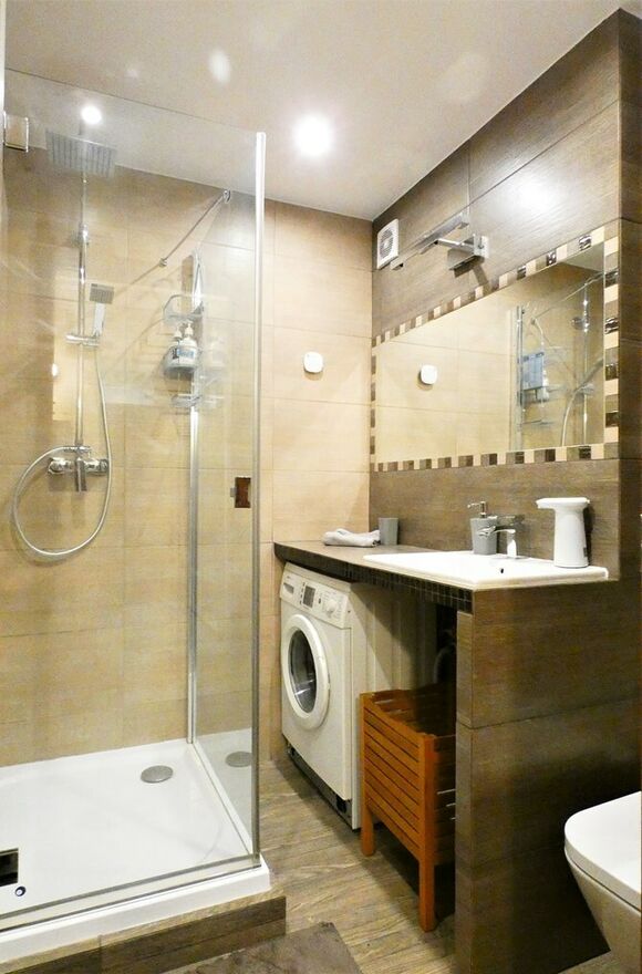 Łazienka: kabina prysznicowa, WC, umywalka, lustro, szafka, pralka.