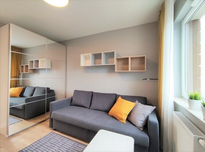 Sypialnia: rozkładana sofa, pojemna szafa z lustrem, półki