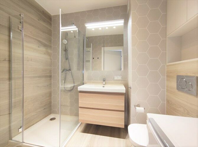 Łazienka: umywalka z szafką, lustro, kabina prysznicowa, pralka, WC,