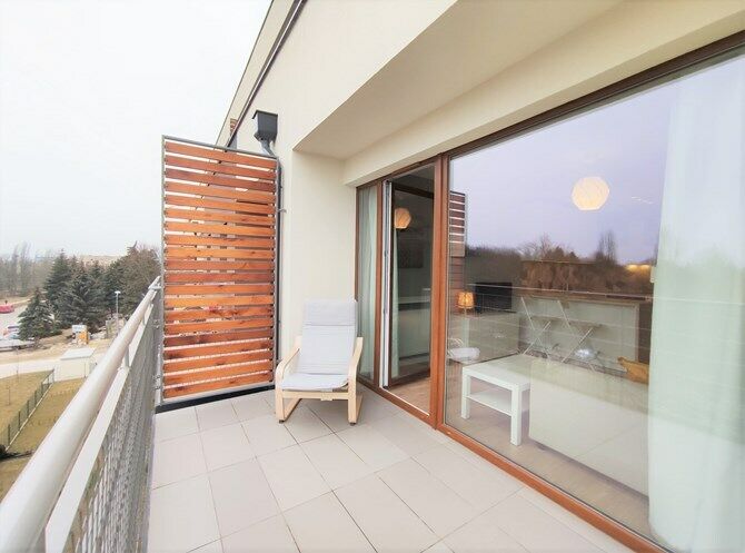 balkonem w nowoczesnym budynku przy ul. Górniczej 26, tuż obok Parku